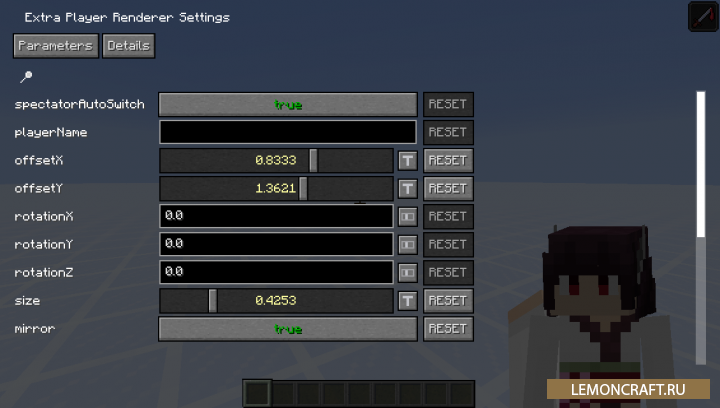 Мод на реальную модель игрока ExtraPlayerRenderer добавляет в правый нижний угол экрана отображение модели игрока в реальном времени. В моде присутствуют настройки, интерфейс которых можно открыть клавишей F8. В настройках вы можете установить размер модели и ее позицию на экране.